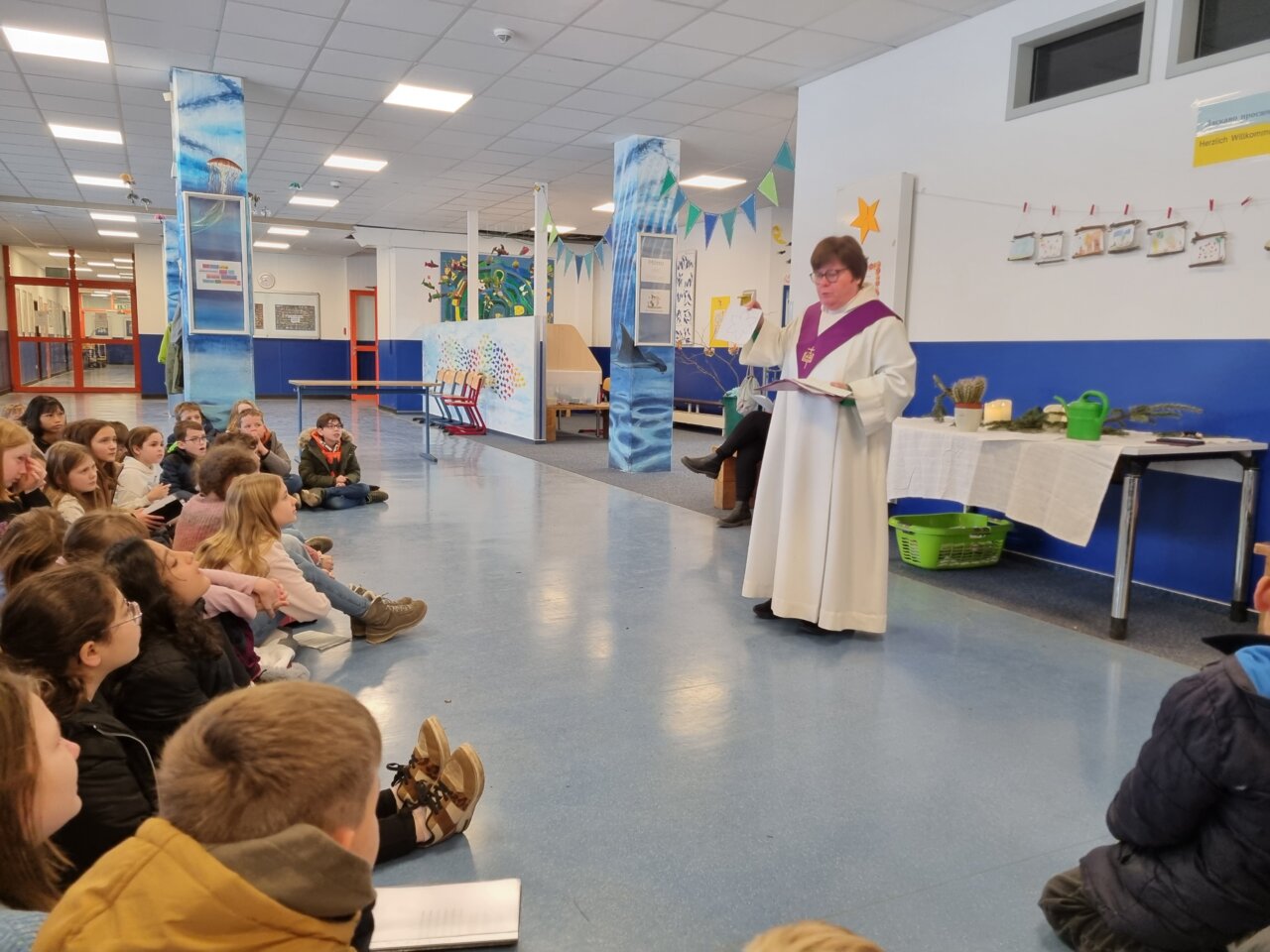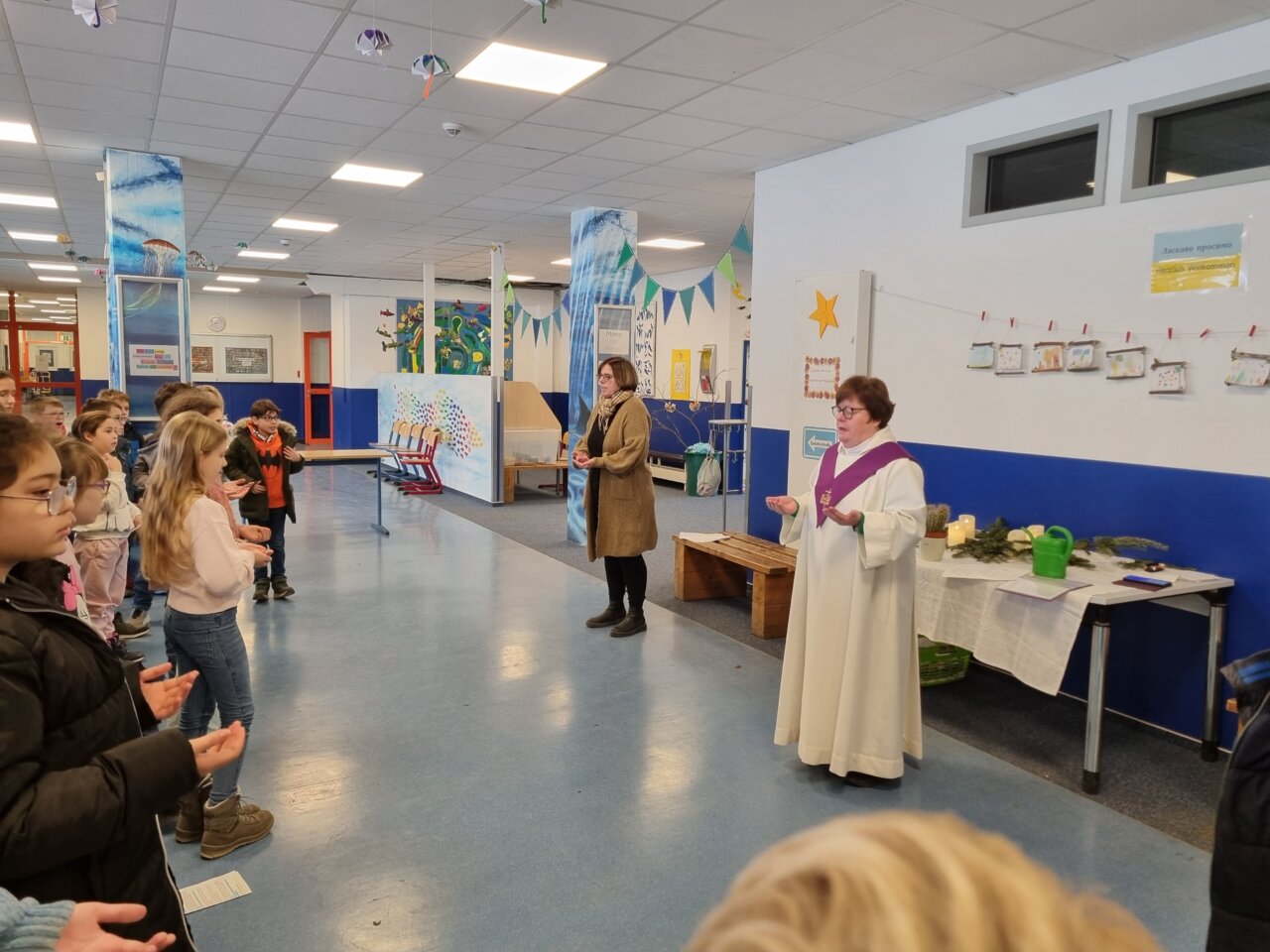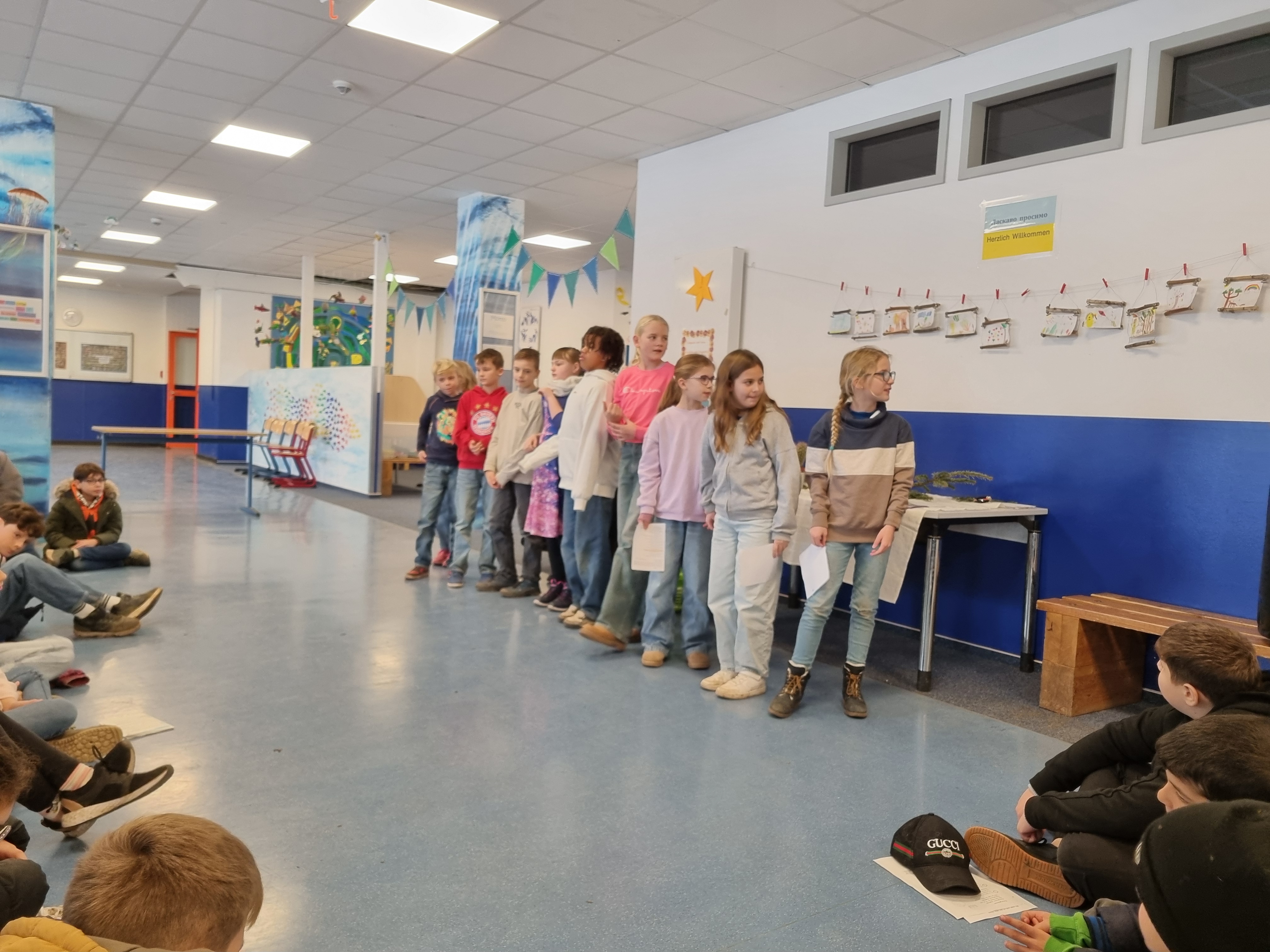 Am 16.12. durften sich alle Kinder der 4. Klassen bei einem gemeinsamen Adventstreffen in der Aula auf Weihnachten einstimmen. Nach der großen Pause versammelten sich die Seehunde, Löwen und Füchse sowie Frau Reinhardt, Frau Grimm, Frau Stumpf, Frau Hauser-Götz und Frau Kühne in der Aula. Auch einige Eltern kamen, um mitzusingen und der gemütlichen Runde beizuwohnen.